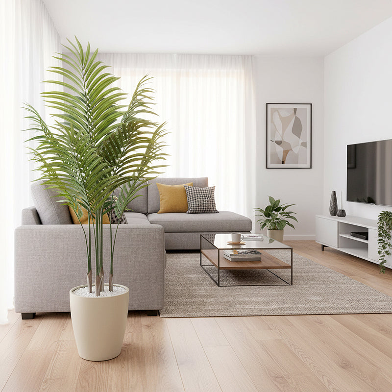 このフェイクグリーン・アレカヤシは、リアルな質感でトロピカルデザインを