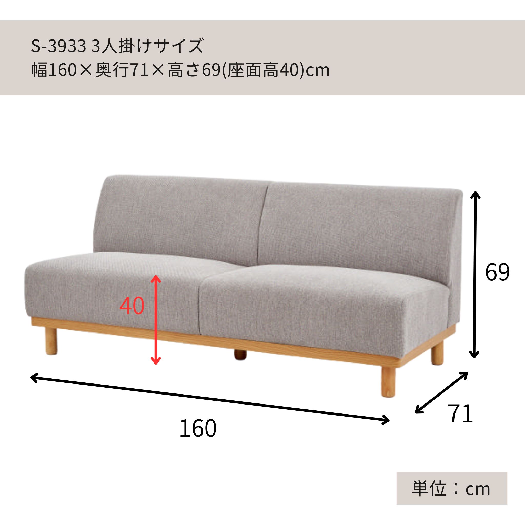 3人掛け:幅160×奥行72×高さ69cm(座面高40cm)