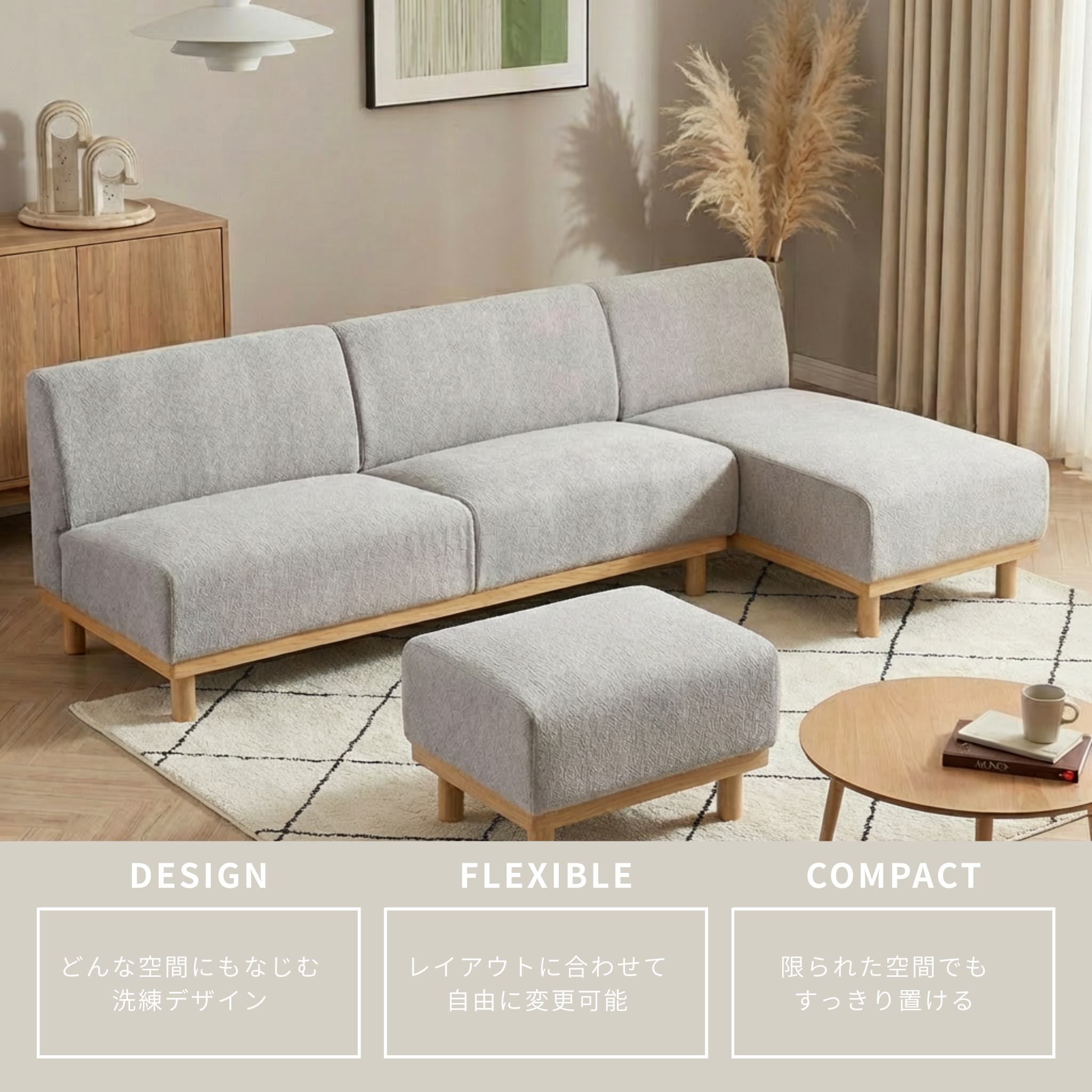 間取りやライフスタイルに合わせて、パズルのように組み替えられるユニットソファ。上質な座り心地と、どの角度から見ても美しいデザインが、リビングに理想の「居場所」を作り出します。