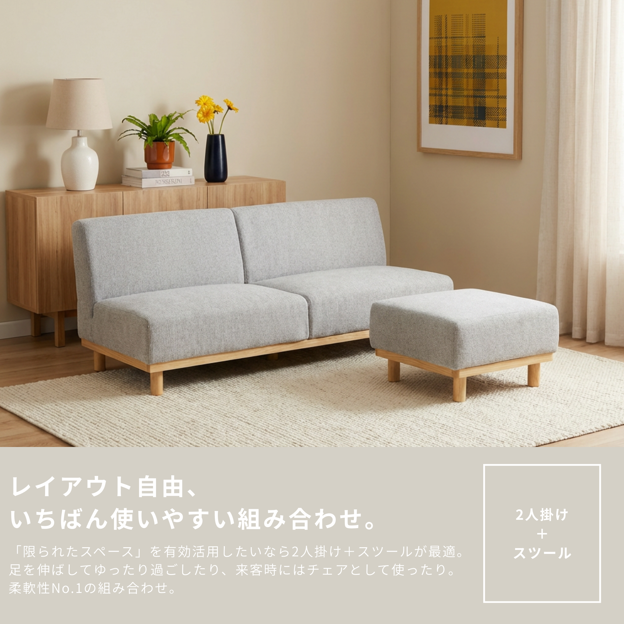 2人掛け+スツール:足置きにしたり、来客用の椅子にしたり。柔軟性No.1。
