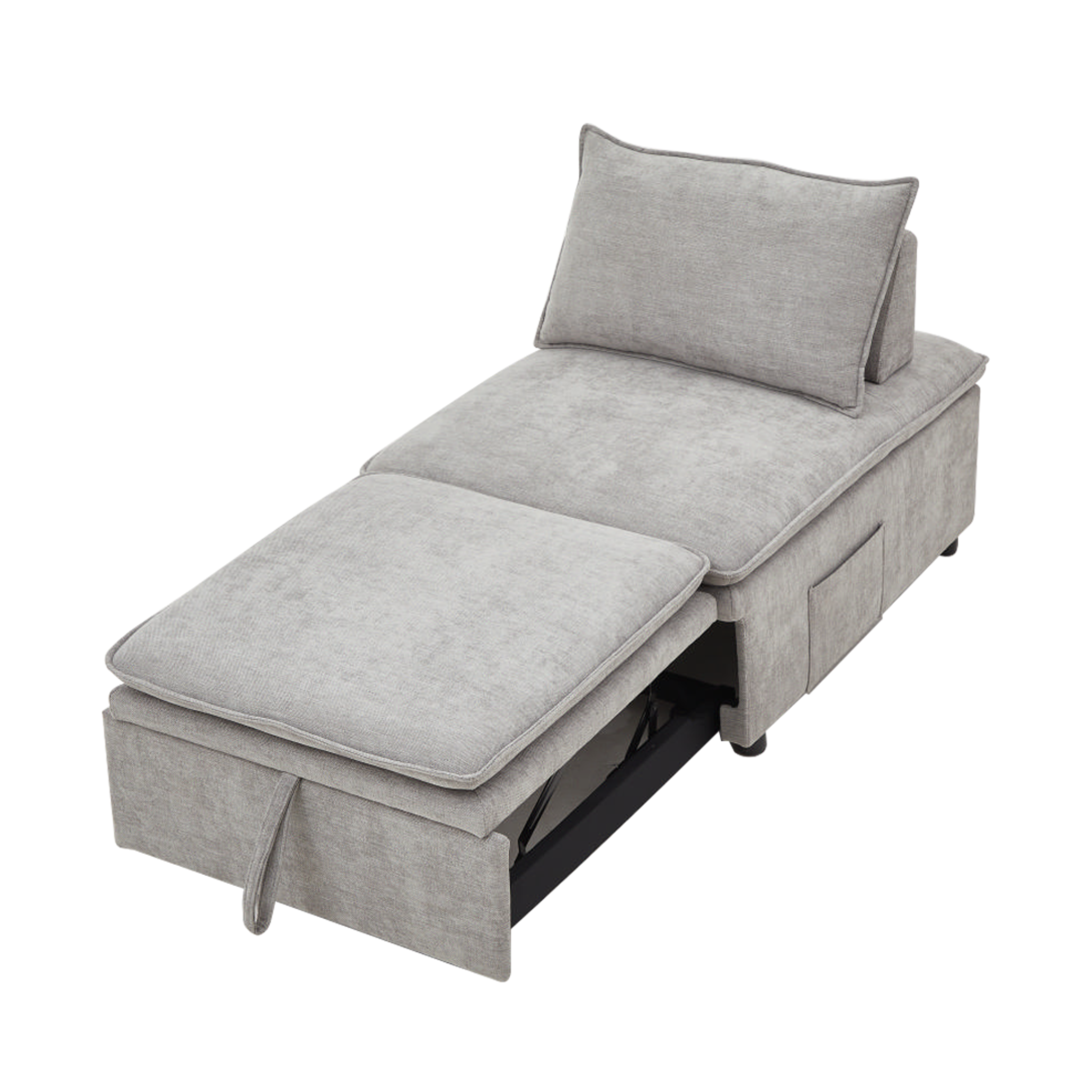 肘掛けには、リモコンや雑誌をスマートに収納できるサイドポケットを配置。さらに、本体と同色のクッションが付属しており、背当てや枕としてマルチにご活用いただけます。「収納」と「くつろぎ」を一台に凝縮した、こだわりの設計です。