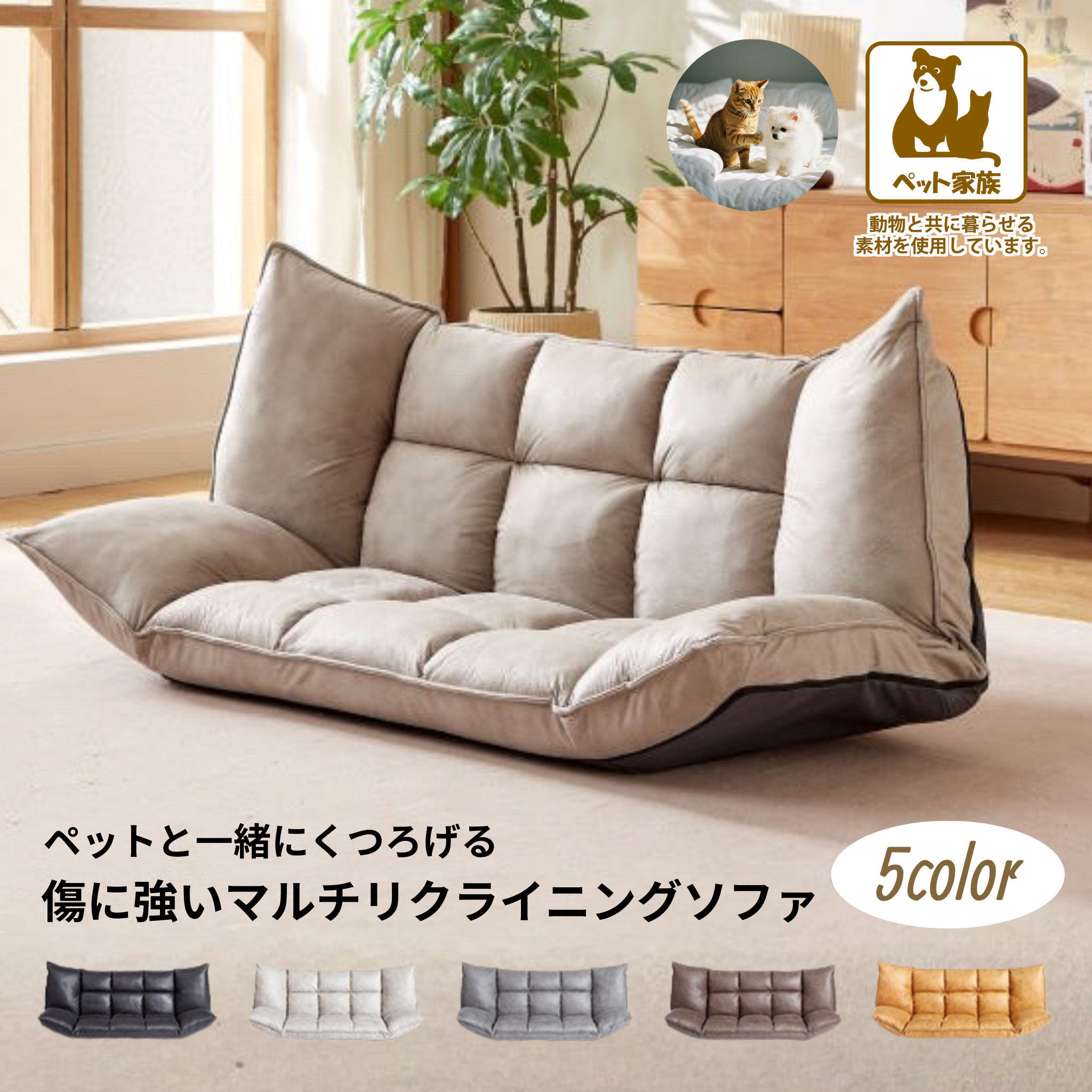 動物と共に暮らせる耐久性の高い素材を採用。一般的な織物生地に比べ、ペットの鋭い爪による引っかき傷がつきにくいのが最大の特徴です。傷を気にせず、大切なパートナーと一緒に心ゆくまでくつろげます。
